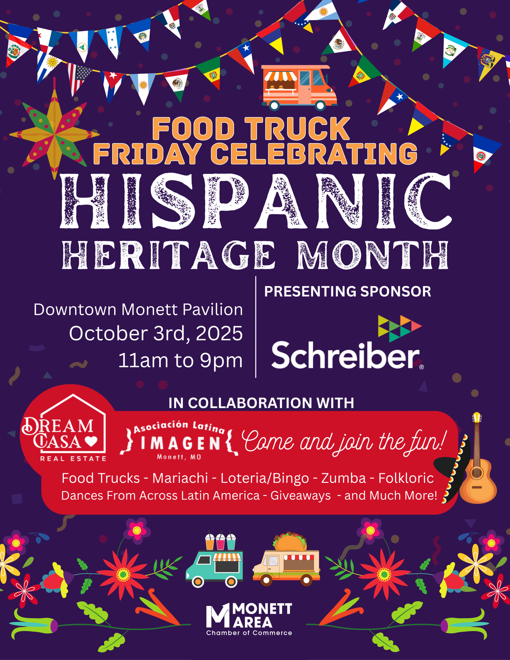 Join us in Downtown Monett for a full day of amazing food, music, and culture as we celebrate Hispanic Heritage Month!