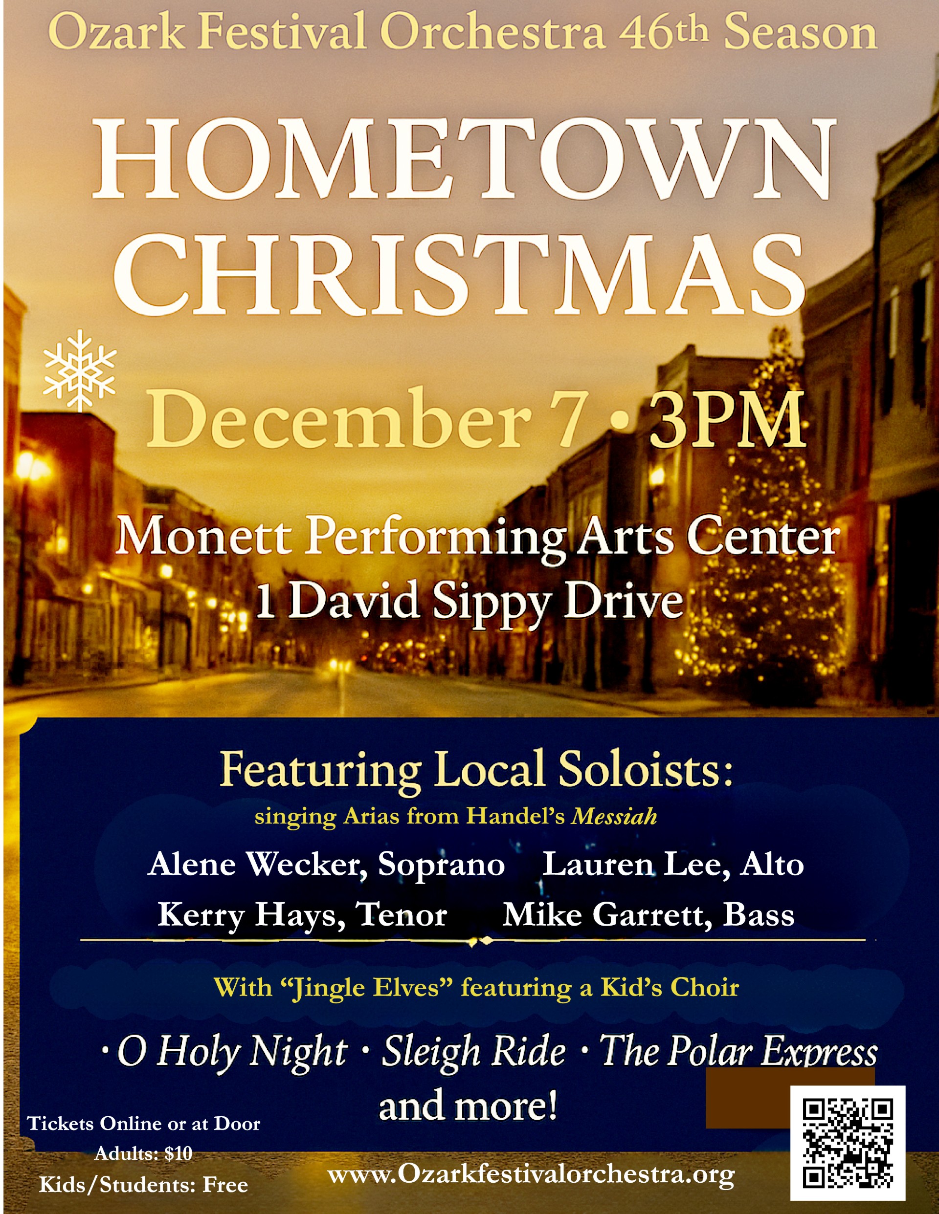 The Ozark Festival Orchestra will continue its 46th season of concerts in Monett at 3 p.m. on Sunday, December 7, at the Monett High School Performing Arts Center with a celebration of Christmas. Under the baton of music director Carla Wootton, the OFO will play holiday favorites and have soloists present excerpts from Handel’s “Messiah.”