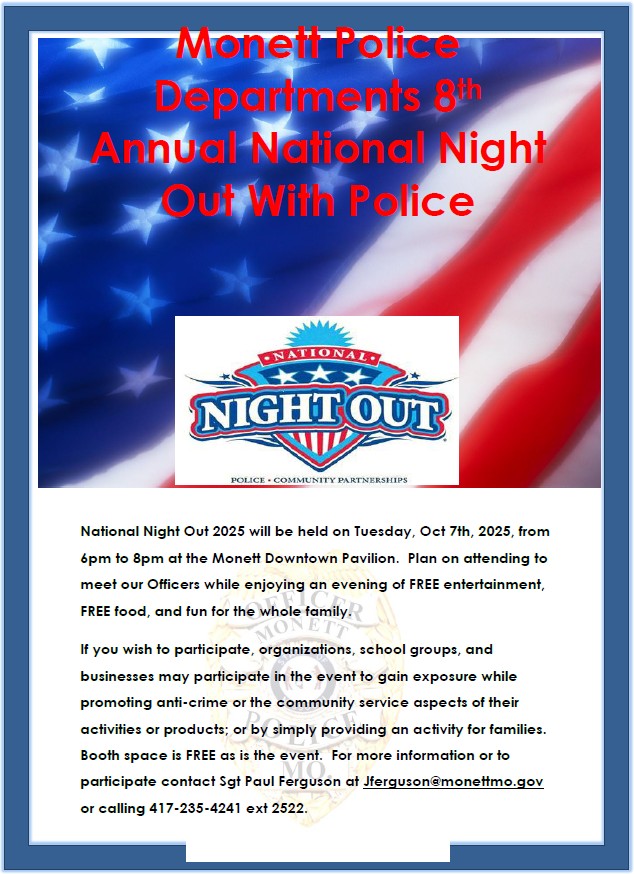 Calling all cars, Calling all cars, Come and vist with the Monett Police Department for a fun time at our 9th annual National Night Out with Police. 104 […]