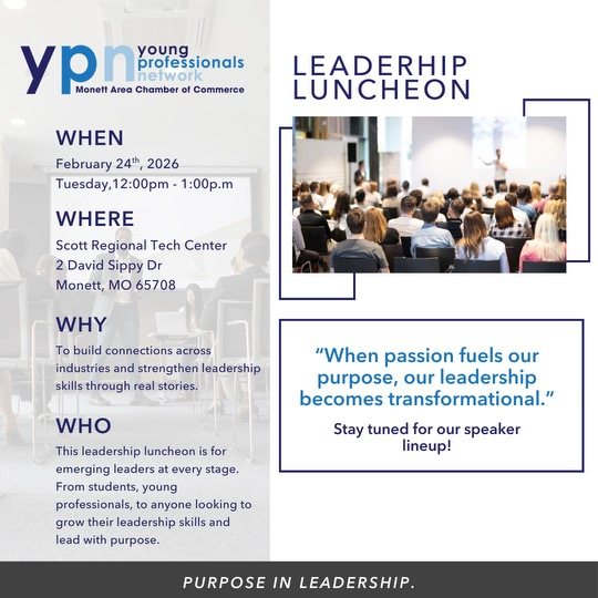 The location for the next meeting will be announced during the current meeting and distributed via electronic resources. The meetings will be held at different locations throughout the year to enhance the dynamic and visibility of the Young Professionals in the Monett community.